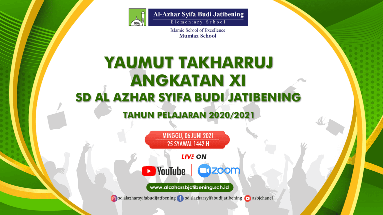 Yaumut Takharruj SD Al-Azhar Syifa Budi Jatibening Angkatan 11 Tahun Pelajaran 2020/2021, Minggu, 06 Juni 2021/25 Syawal 1442 H. Dilaksanakan secara virtual melalui aplikasi Zoom dan disiarkan secara langsung (Live Streaming) di Channel Youtube SD ASBJ CHANNEL.